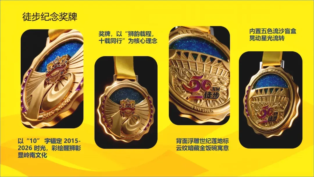 在标准版基础上,加赠第十届专属纪念奖牌。这枚奖牌以 “狮韵载程,相伴同行” 为核心理念,是活动精神的凝结。奖牌内置5种色彩的流沙(宝石红、午夜蓝、孔雀蓝、星云紫、丁香紫),将以盲盒形式随机发放,为第十届徒步之旅增添一份独特惊喜与收藏价值,既是挑战自我的勋章,也是定格佛山记忆的城市信物。