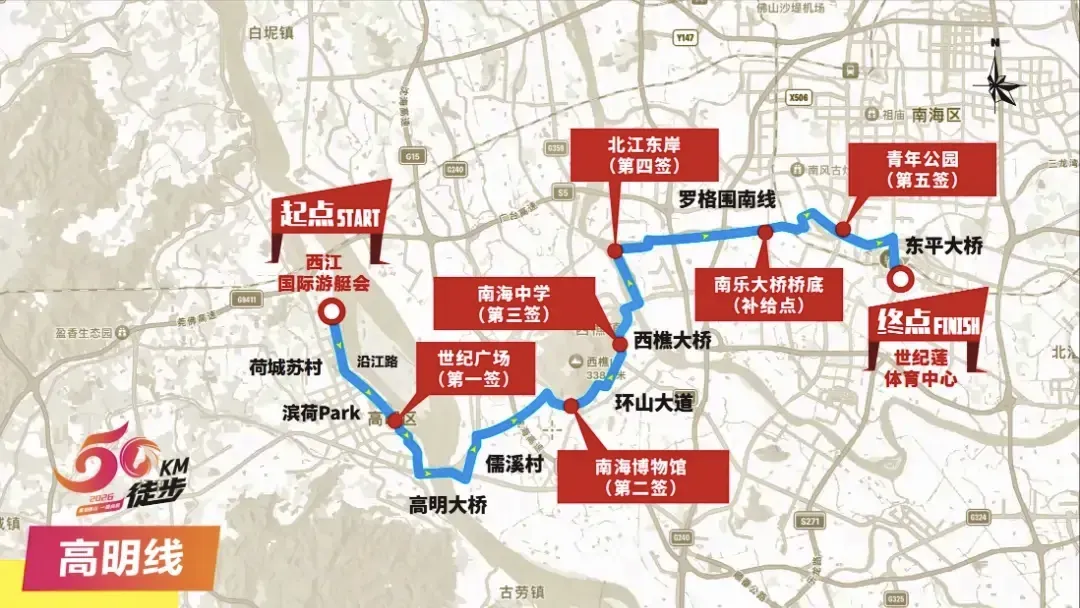 西江国际游艇会(起点沿江中路)→荷城苏村→沿江路→滨荷Park生态文创园→荷城公园→世纪广场(第一签)→灵龟公园→高明大桥(旧桥)→龙高路(加油站)→新田村健身步道→樵高路(海舟三乡路口)→儒溪村→环山大道→南海博物馆(第二签)→环山花海→环山绿道→山根新村→南海中学(第三签)→西樵大桥→北江东岸(第四签)→沿江路→南庄一桥→南乐大桥桥底(补给点)→罗格围南线→周尾围生态公园→凤翔大桥→江滨路→青年公园(第五签)→江滨路→东平路→东平大桥→滨河景观公园→世纪莲体育中心(终点)