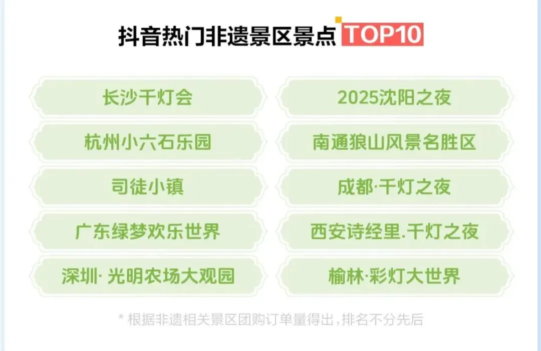 抖音《2025文旅数据报告》显示:非遗酒旅相关团购订单量同比增长45%,非遗景区成最受欢迎品类之一;长沙千灯会、沈阳之夜、司徒小镇、成都“千灯之夜”等入选十大热门非遗景点。
