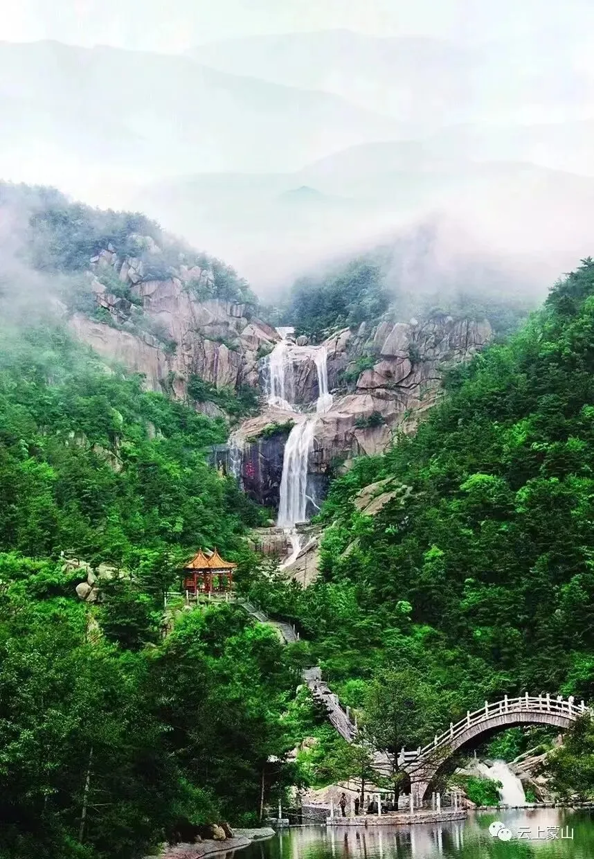 中国瀑布是蒙山的标志性景观之一,因瀑布所挂崖壁轮廓酷似中国版图而得名,从中路登山会经过这个景点。此瀑布为江北罕见的三叠式瀑布,水流从高约百米的悬崖上一跃而下,十分壮观。瀑布周围水雾缭绕,彩虹时现,绚丽多彩,与雄伟的山峰、青翠的林海构成一幅绝美的自然画卷。瀑布左侧石崖中间有一石门被水帘所掩,故亦称水帘洞瀑布,相传是战国时期孙膑、庞涓,在此跟鬼谷子王禅学艺并修炼得道成仙的地方,每五百年开启一次。明朝诗人公鼐有诗赞曰:岂是银河落,飞来万丈余。谪仙如可见,不复问匡庐。观瀑亭是观赏中国瀑布的绝妙位置,瀑布胜景一览无余。