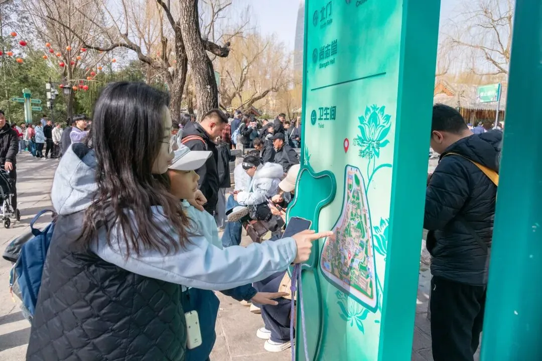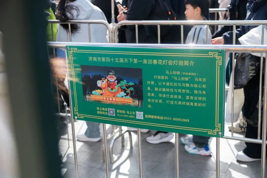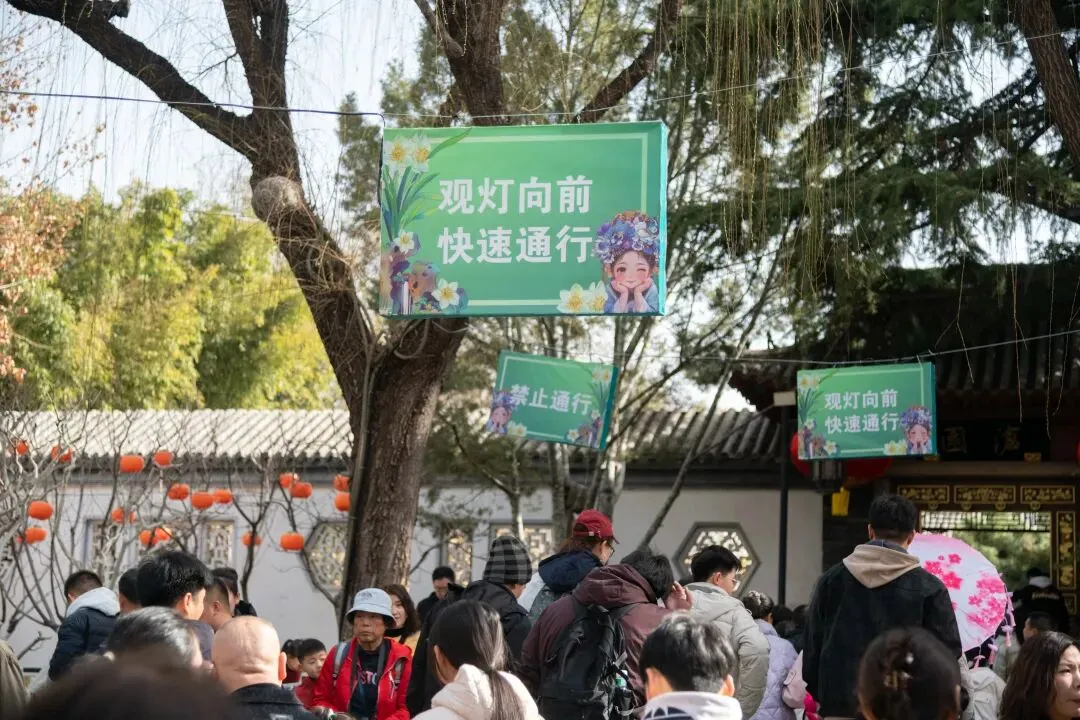 景区联动公安、消防、交警、城管、辖区办事处等多部门协调联动,利用智慧景区监控系统实时监测客流量,采取“重点部位单循环、各门口弹性双缓冲”的限流措施。全园区增设80余处指引标识,并在三个门口的排队护栏上悬挂40余块灯会展示牌,为游客提供更加清晰便捷的游览指引。