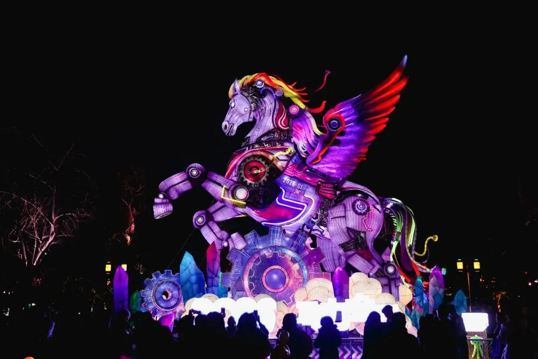 《南门贺岁·悦马泉城》展区以瑞马为核心,融泉城灵秀与民俗雅意于光影之间,将传统闹春元素、生肖贺岁、泉水茶韵、齐鲁曲艺巧妙交融,在千年泉水潺潺流淌间,开启一场凝聚民俗暖意与泉城风华的新春灯宴。