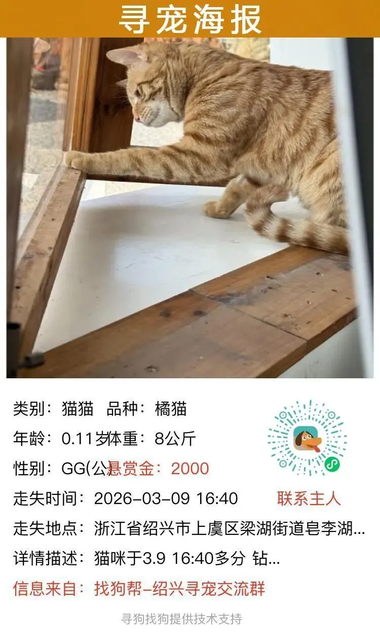 #绍兴寻猫# 上虞区梁湖街道皂李湖景区北岸马湾驿站附近走失一只橘猫,如有好心人看到或者收留请联系主人或本平台