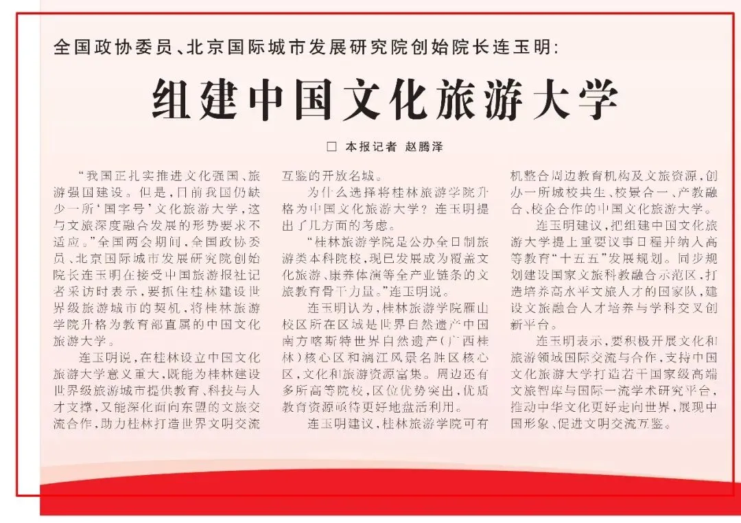 “我国正扎实推进文化强国、旅游强国建设。但是,目前我国仍缺少一所‘国字号’文化旅游大学,这与文旅深度融合发展的形势要求不适应。”全国两会期间,全国政协委员、北京国际城市发展研究院创始院长连玉明在接受中国旅游报社记者采访时表示,要抓住桂林建设世界级旅游城市的契机,将桂林旅游学院升格为教育部直属的中国文化旅游大学。