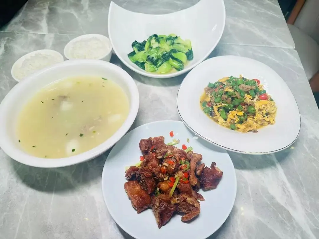 香酥脆皮鸭、阿婆菜炒鸡蛋、白玉冬瓜排骨汤、粒粒丝苗白米饭、时令蔬菜;