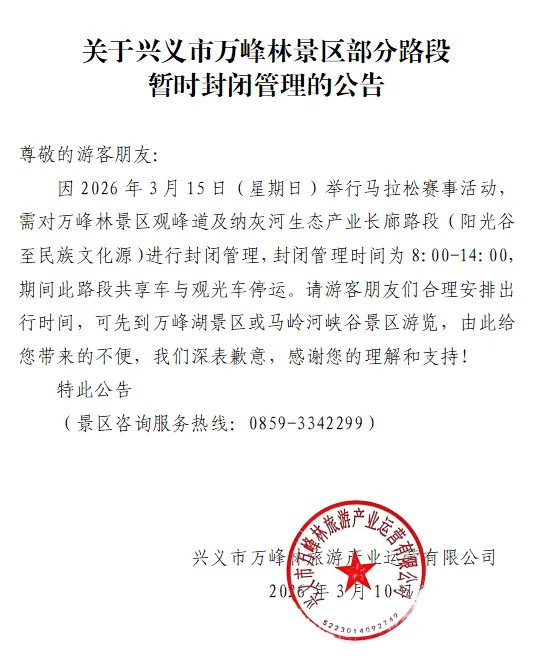 因2026年3月15日(星期日)举行马拉松赛事活动,需对万峰林景区观峰道及纳灰河生态产业长廊路段(阳光谷至民族文化源)进行封闭管理,封闭管理时间为8:00-14:00,期间此路段共享车与观光车停运。请游客朋友们合理安排出行时间,可先到万峰湖景区或马岭河峡谷景区游览,由此给您带来的不便,我们深表歉意,感谢您的理解和支持!