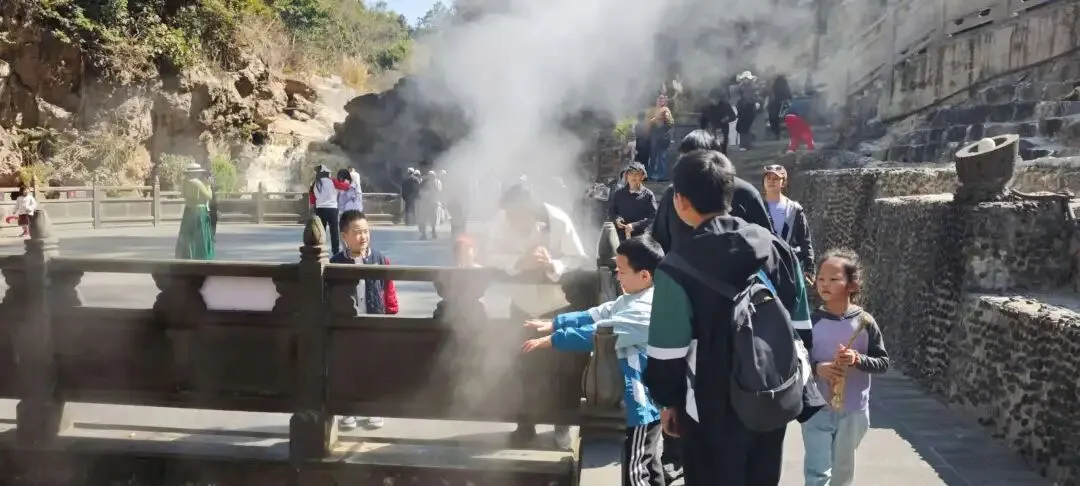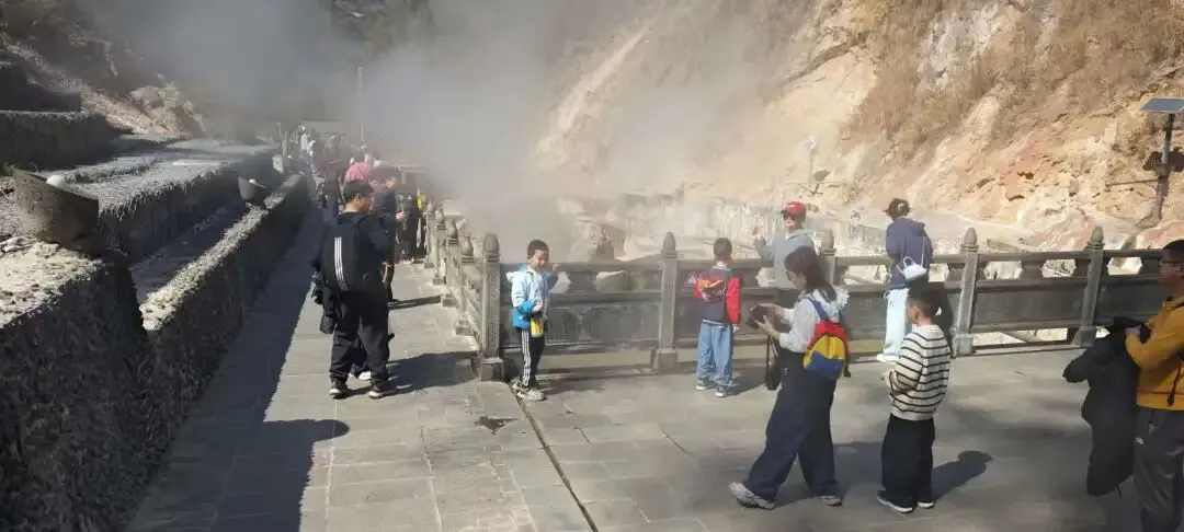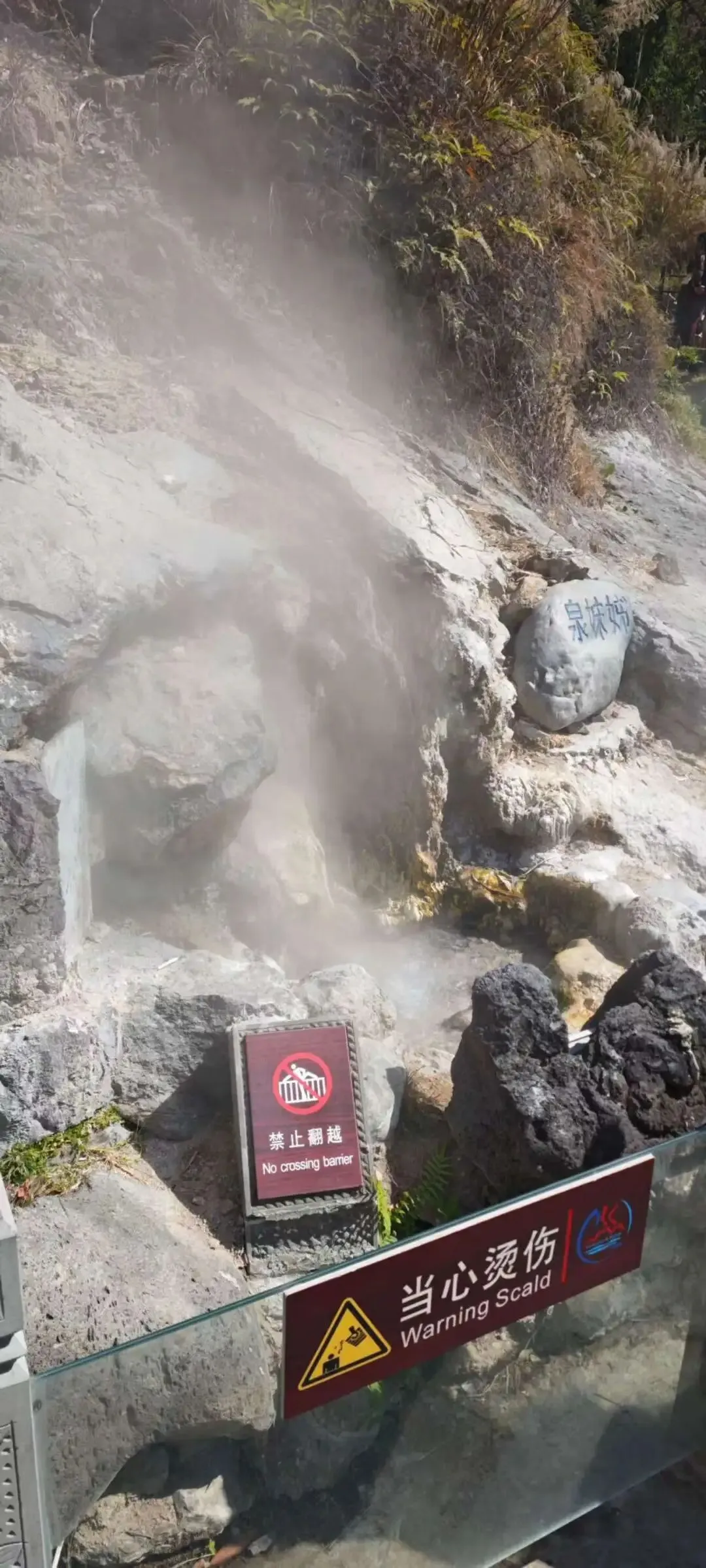 一路上,各种滚烫的温泉冒着热气从地下喷涌而出,甚至带着各种响声,充满了浓烈的硫磺气味,站在温泉池边热气扑面而来。这是在其他地方感受不到的独特奇观。 而且步行爬山的过程也不算费力,带着两小只,我们也轻松到达了最后一个核心景点——热海大滚锅。和沿路的景观相比,这个大滚锅反而显得平平无奇了。