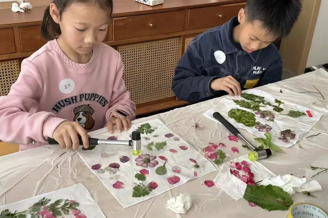 亲子协作植物拓染,天然素材创作独一份的春日手作,作品可带走留念哦。