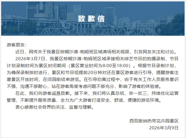 3月10日,西双版纳热带花卉园景区发布致歉声明称,3月7日,该景区棕榈沙滩-帕姆班区域承接相关综艺节目的拍摄录制,节目计划录制时间为景区封闭期间(景区营业时间为8:00至18:00)。