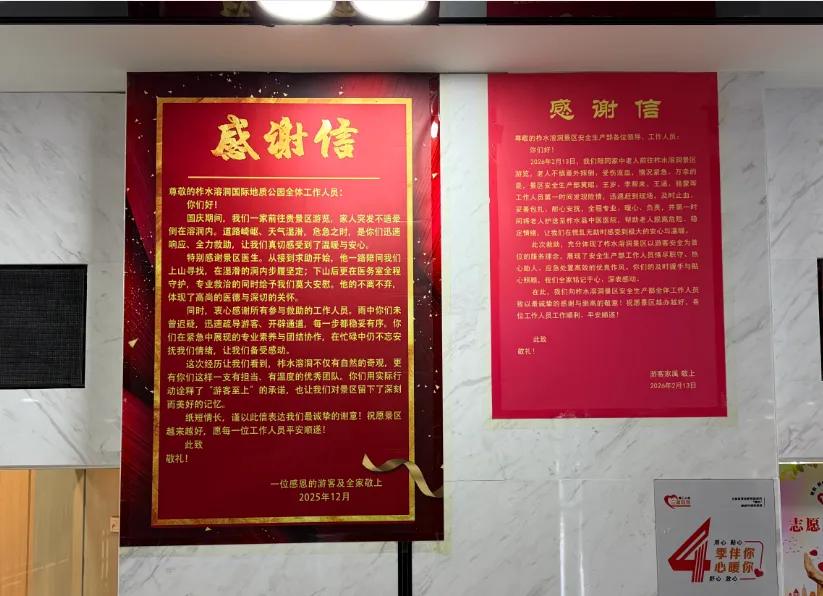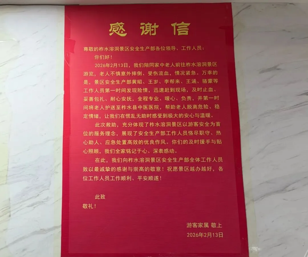 据悉,今年2月份,一名游客在游览柞水溶洞景区途中,不慎意外摔伤,情况紧急。景区安保、医护等工作人员接到求助信号后,第一时间启动应急救援预案,携带急救箱、担架等物资迅速赶赴现场,在为游客进行止血、包扎等紧急处理的同时,耐心安抚游客及同行人员情绪,并全程陪护前往医院协助办理后续就诊手续。经及时救治,游客伤情得到妥善处理,康复后,该游客特意寄送锦旗与感谢信,对景区工作人员反应迅速、处置专业、服务贴心的表现予以高度赞扬。感谢信中提到,景区工作人员的细致照料与高效救援,让其在意外中倍感温暖,真切感受到柞水溶洞的人文关怀与专业实力。