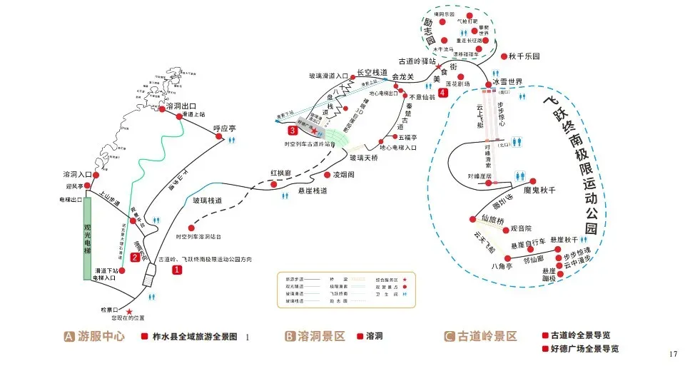 二、省时、省力路线:检票口进入景区 ——观景电梯至溶洞入口(约30秒)——溶洞内游览(约1小时)——大理石滑道(全程3分钟)——古道岭(约1.5小时)——时空列车——玻璃天桥——地心电梯——古道岭驿站小吃街 ——秋千乐园 ——极限滑索/玻璃滑道(二选一)——时空列车——景区出口。(游览全程大约3小时)
