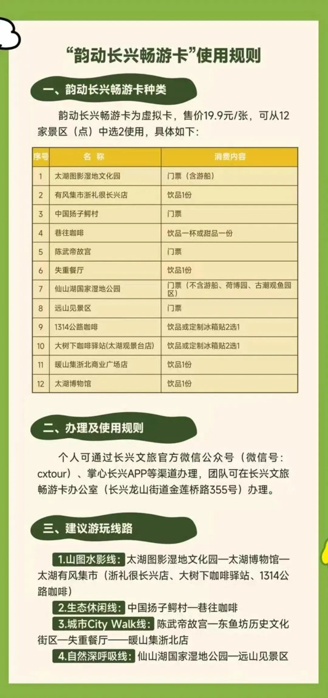 19.9元办理“韵动长兴畅游卡”,即可在以下12家景区(点)任选两个使用: