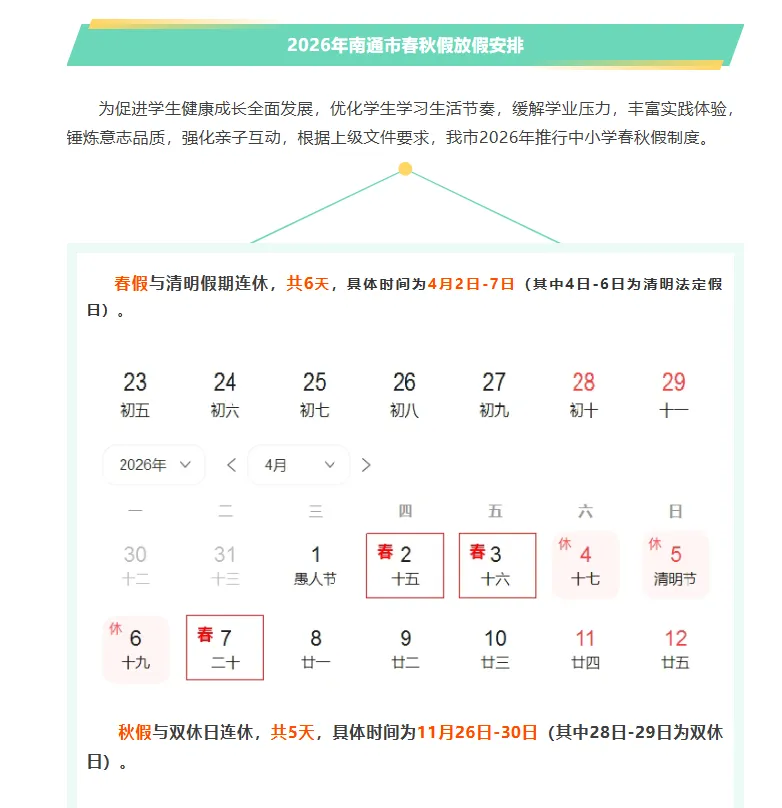 此前,南通市教育局发布消息,确定南通市义务教育学校春秋假时间为4月2日、3日和7日,与清明假期(4月4日—6日)连休,共6天。