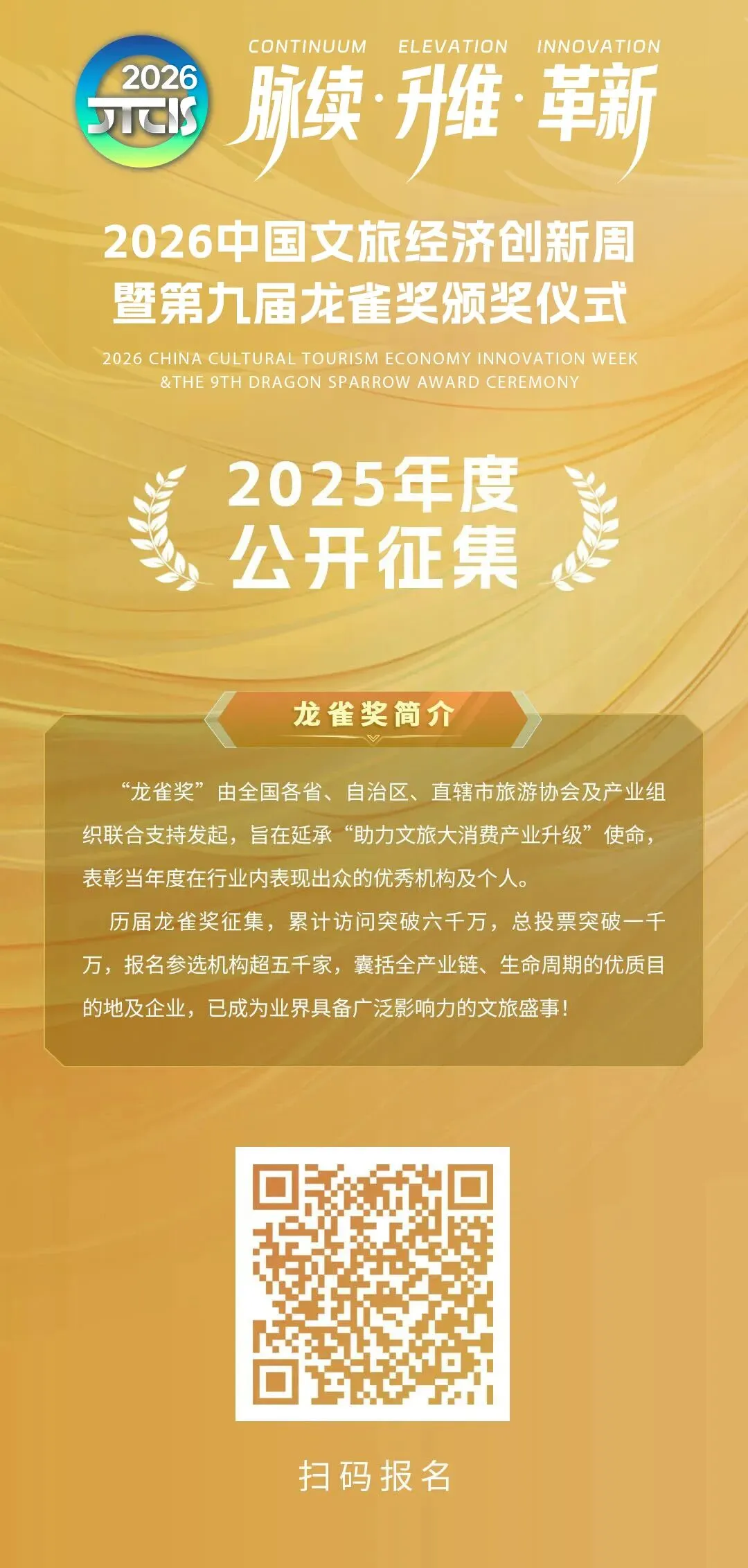 在文旅产业深度融合与数字化转型的浪潮中,第九届龙雀奖正式面向全球启动报名征集!作为文旅行业最具影响力的专业奖项之一,龙雀奖始终致力于推动文旅产业的创新发展,表彰在行业内表现卓越的机构、项目和个人。2026 年,我们诚邀您共襄盛举,以创意为翼,见证文旅未来。更多第九届龙雀奖信息,请扫描下方二维码或点击左下方"阅读原文"提交申报资料。