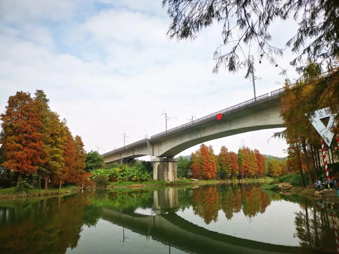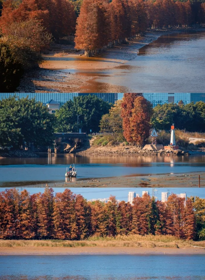 龙湾涌的落羽杉色彩斑斓,暖黄与橙红交织