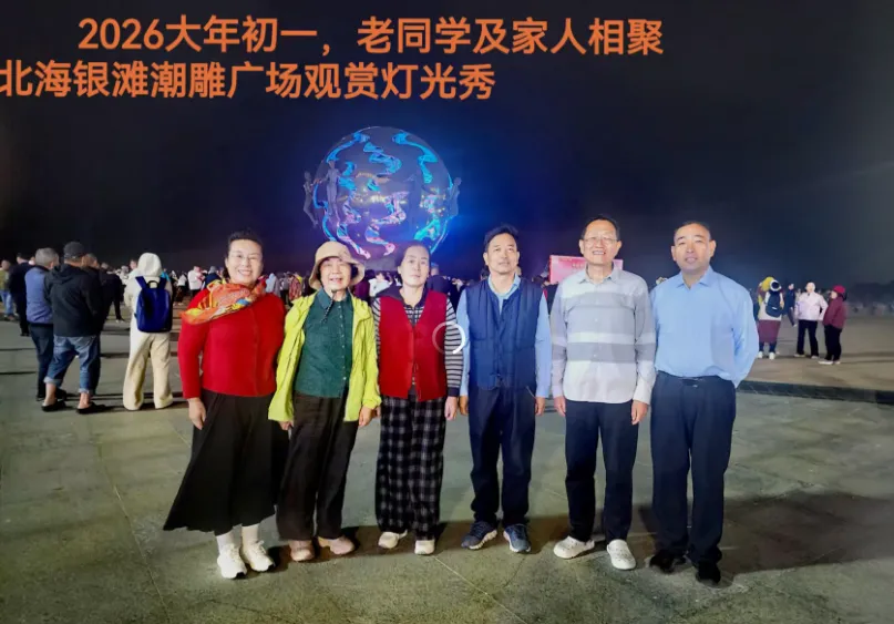 观赏美景的同时,更让人欣慰的是我师范赵忠善同学夫妇和他的亲家王海德夫妇也来北海过春节,我们三家人相聚在银滩的“潮”雕广场,一起体验和见证了“天下第一滩”春节的“海潮、人潮和灯光潮”的壮观。“一生中能有几个这样的夜晚,一辈子能有几次不想说再见……”,一波又一波的灯光水柱流光溢彩照亮了夜空。当灯光秀再次升起时,我们抓住契机,三家人在“潮”雕前合影留念,留住这难忘的美好,定格这难得的相遇。海风轻轻吹拂着,带走了半世的风霜,留下的是温暖的同窗之情。
