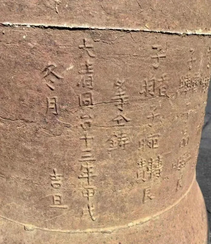 无独有偶,热心网友“白下”也在某社交平台发布相关消息,附上铁钟实拍图并进一步考证:根据钟身铭文“大清同治十三年甲戌冬月吉旦”判断,这口铁钟铸造于1874年,距今已有近150年历史。