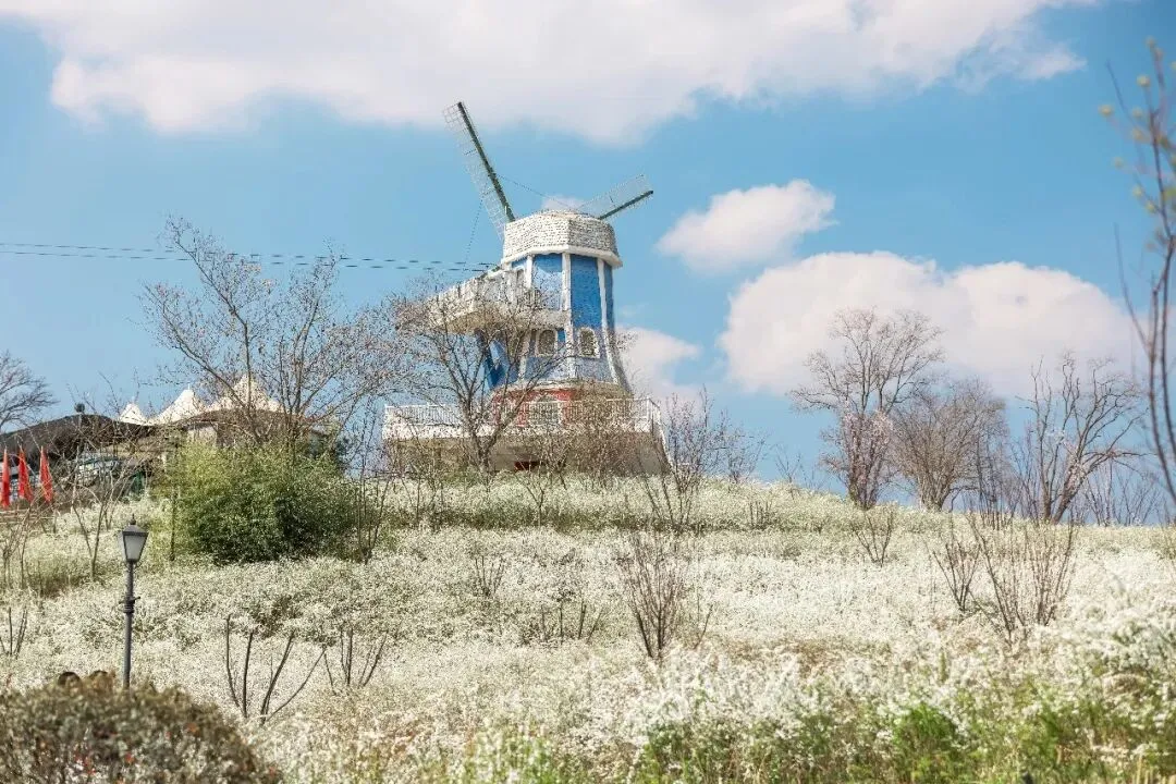 雪柳作为春季最早的切花之一,因枝条细长如柳、花开时满枝覆白似雪而得名。祥源花世界内千株雪柳正值盛花期,风车花山区域漫山遍野的白色花簇,远观如雪山覆岭,近看似繁星缀枝,成为春日里极具辨识度的风景线。其花语蕴含“殊胜、丰收、好兆头”,插瓶养护后能逐步绽放花苞,为居家生活增添盎然春意。