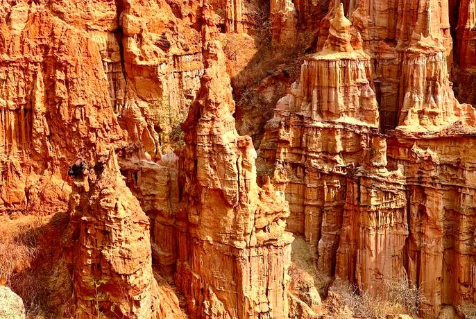 红色土林的土是红色的,这是因为土壤里含铁量高,被氧化以后就变成了这种砖红色,整片土林看上去像被火烧过一样。红色土林的规模不大,但胜在颜色特别,拍照很出片,尤其是有蓝天的时候,红色土柱和蓝色天空形成强烈对比,那种视觉冲击力很强。