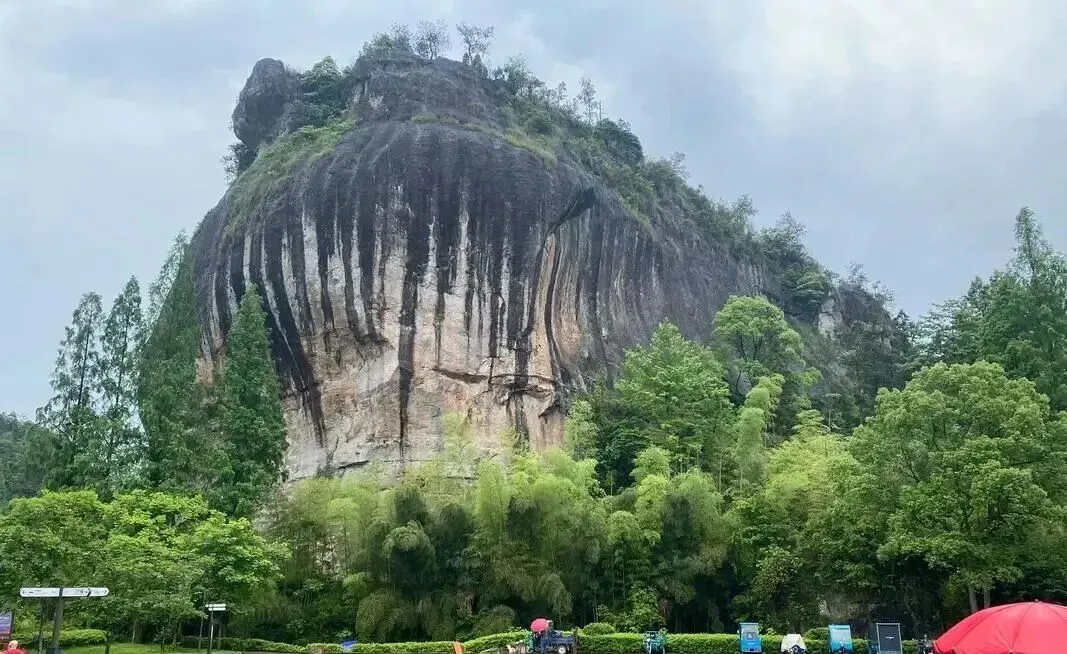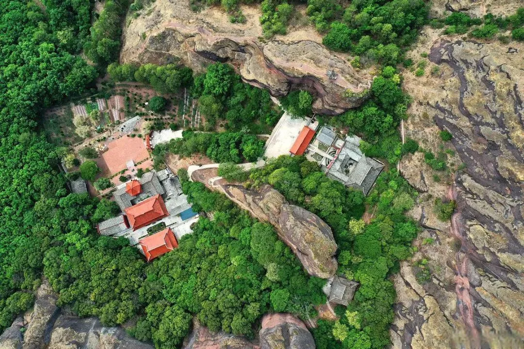 剑劈石:高67米,宽40米,传说为吕洞宾剑劈而成,岩体通体赫红,裂痕如刀削斧砍,宏伟壮丽。