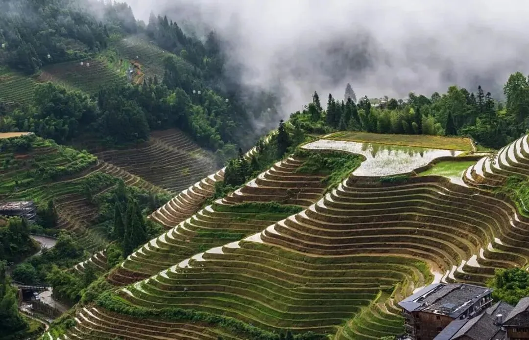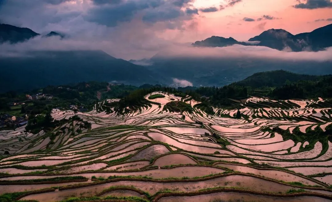 早起看景:如果天气好,一定不要错过九曲云环的日出,梯田水面在晨光中像碎镜一样闪耀 。