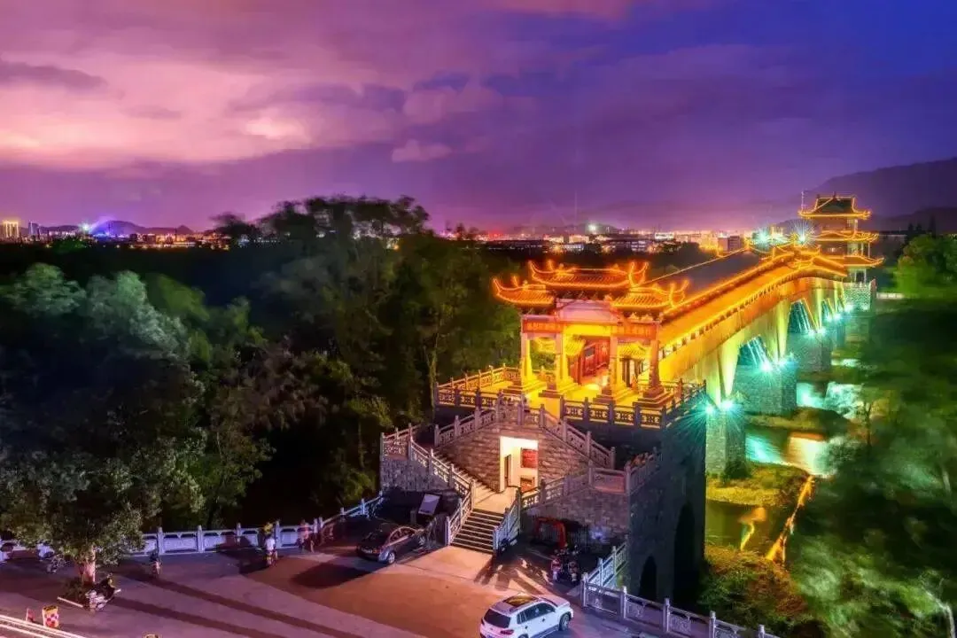 九龙廊桥:亚洲最长的木拱廊桥,全桥长203.75米,为5跨不等跨木拱结构的仿古景观步行木拱廊桥,夜晚灯光装扮下倒映在水面,景色迷人。