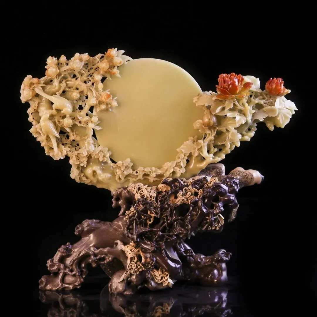 《花好月圆》:中国工艺美术大师倪东方的代表作,曾被评为 “民间国宝” ,被视为无价之宝。大师花费近八个月时间,用一块珍贵的封门冻石,创造出一幅百花拥月、鹊跃花枝的美丽画卷。