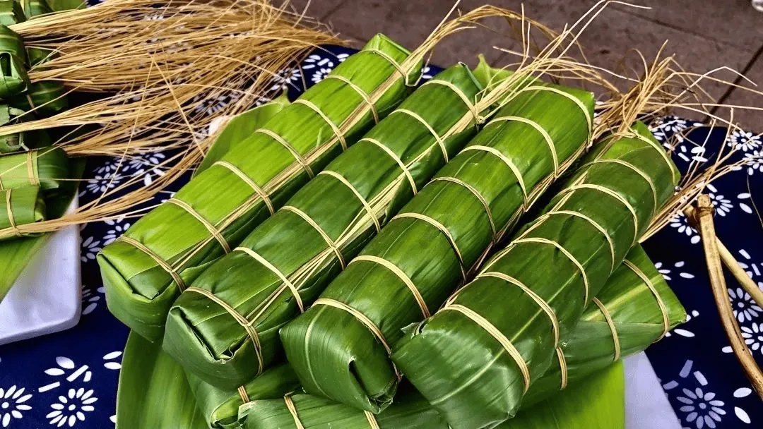 2、遂昌长粽:圆柱形长粽,用高山箬叶包裹,龙须草扎成九节,寓意“长长久久”。