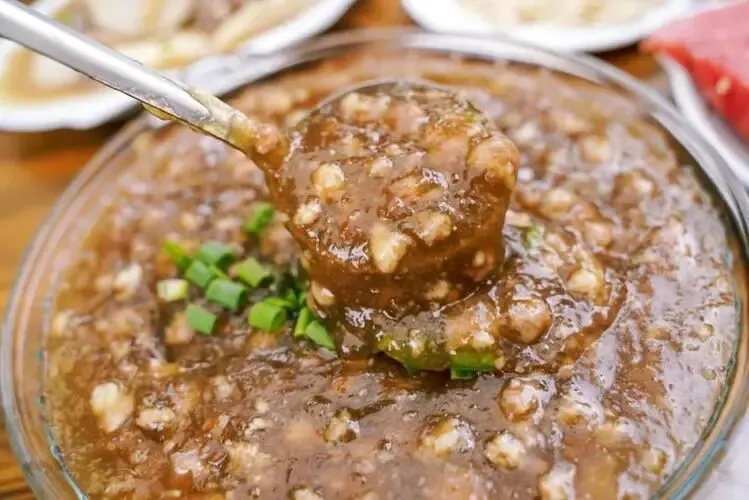 7、缙云敲肉羹:瘦猪肉切片裹番薯粉,敲打至薄如蝉翼,与山珍同煮,汤汁浓郁,肉片脆爽。