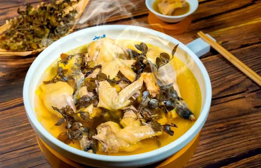 14、畲乡药膳:畲族传统药膳如“黄精凤鸟”(土鸡加中药黄精烹制),肉质鲜嫩,汤汁金黄,带淡淡药香。