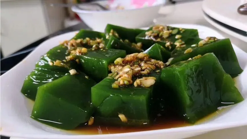 18、青田绿豆腐:呈胶冻状,口感清凉,顺滑如果冻般柔软,是地道的绿色食品,具有清凉解毒功效,是盛夏里防暑降温的佳品。