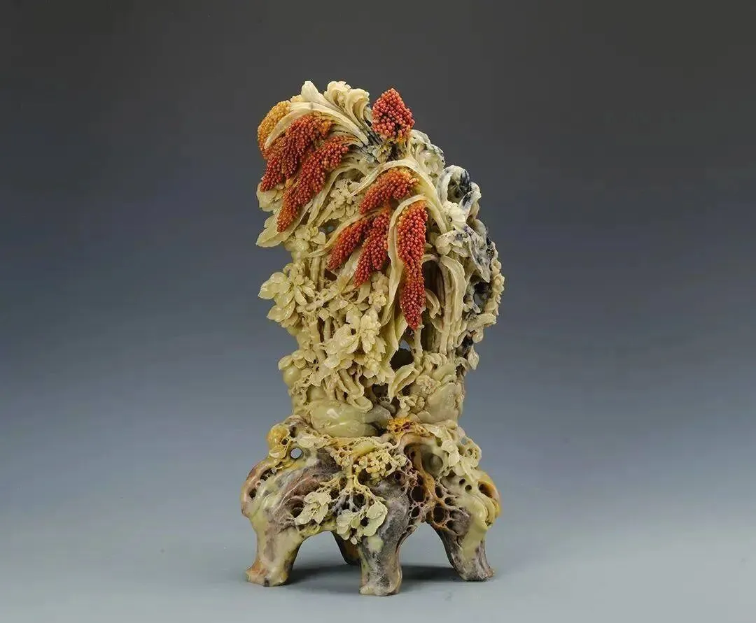 《高粱》:中国工艺美术大师林如奎于1964年创作。大师巧妙利用原石的天然色彩,将红色部分雕琢成饱满的高粱穗,黑色部分则刻画出蛙跳、蝶舞的生动场景,极具情趣。