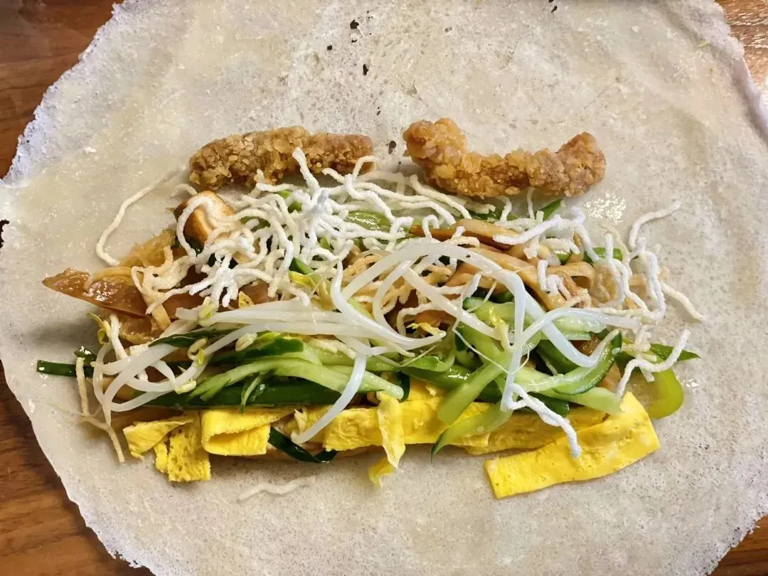15、卷饼:端午吃卷饼是莲都人的习俗,各色各样的菜肴用饼皮一包就成,虽简单但味道极好。