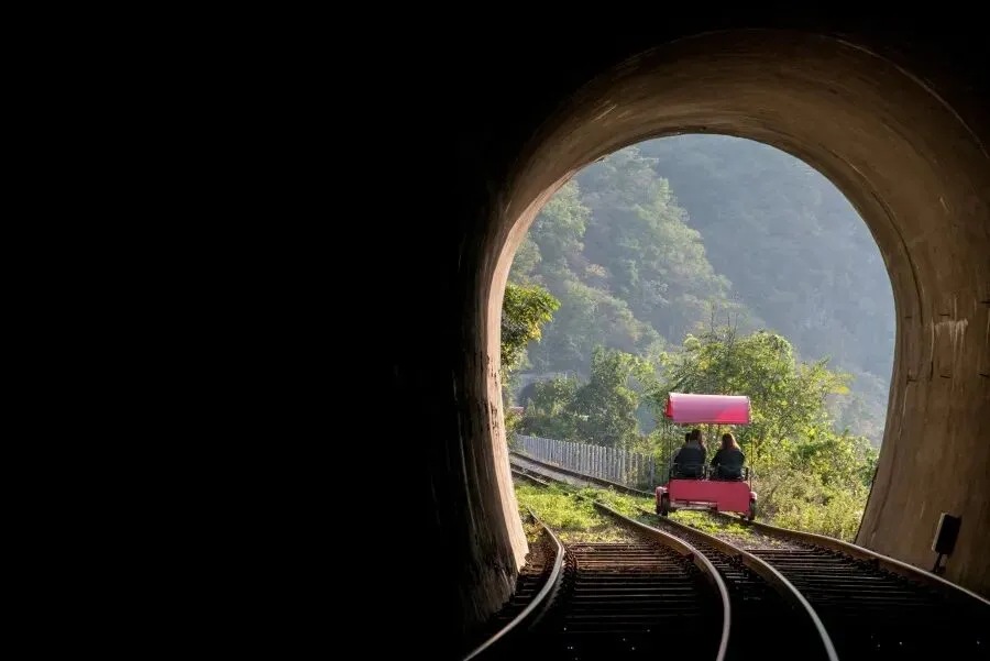 江村铁路自行车 ▶︎ 巨大书本造型物及五色雨伞造型物等拍照区以及咖啡馆、从金裕贞站搭乘处出发,至旧江村站的路线总长8.5km,铁轨脚踏车路段基本上为下坡路,可骑着脚踏车轻松地游览田园风光,欣赏一望无际的美景。