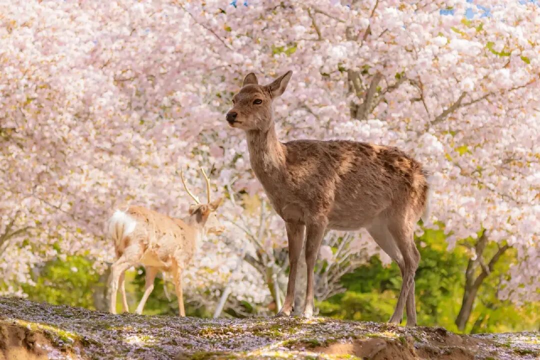 而奈良公园的魅力不是只有鹿群,春天樱花盛开,将整座公园浸染成粉白交织的梦幻乐园。