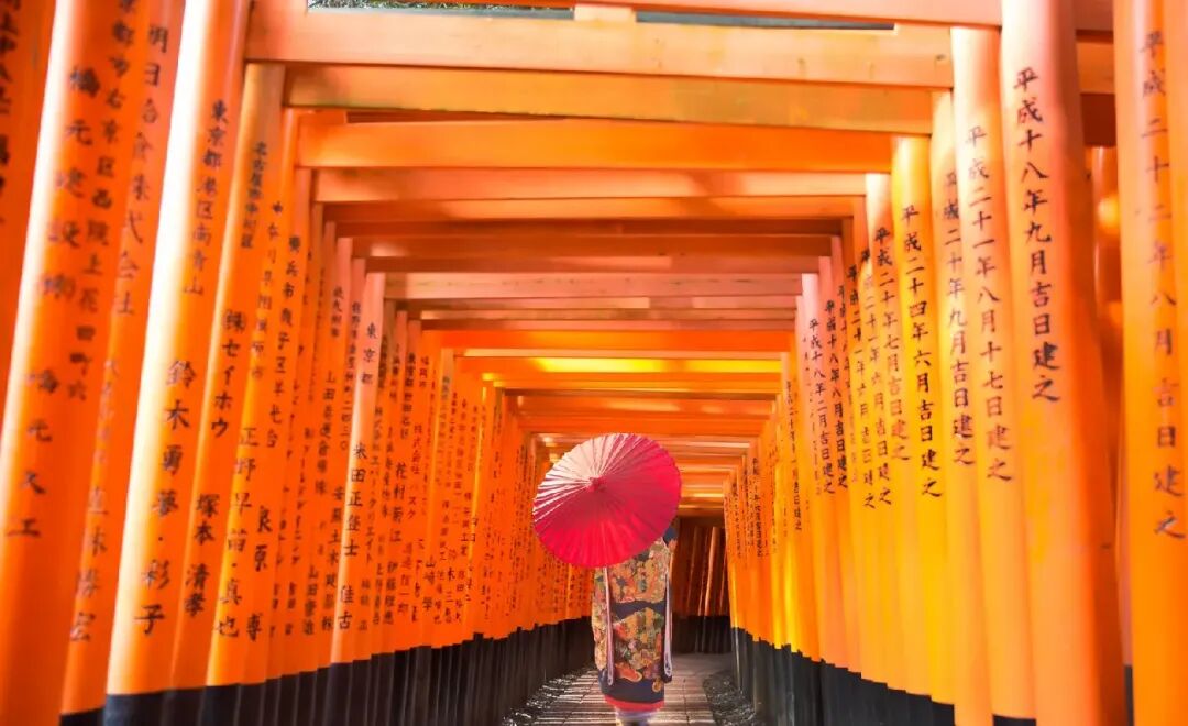 伏见稻荷大社无尽的红色鸟居隧道令人印象深刻。