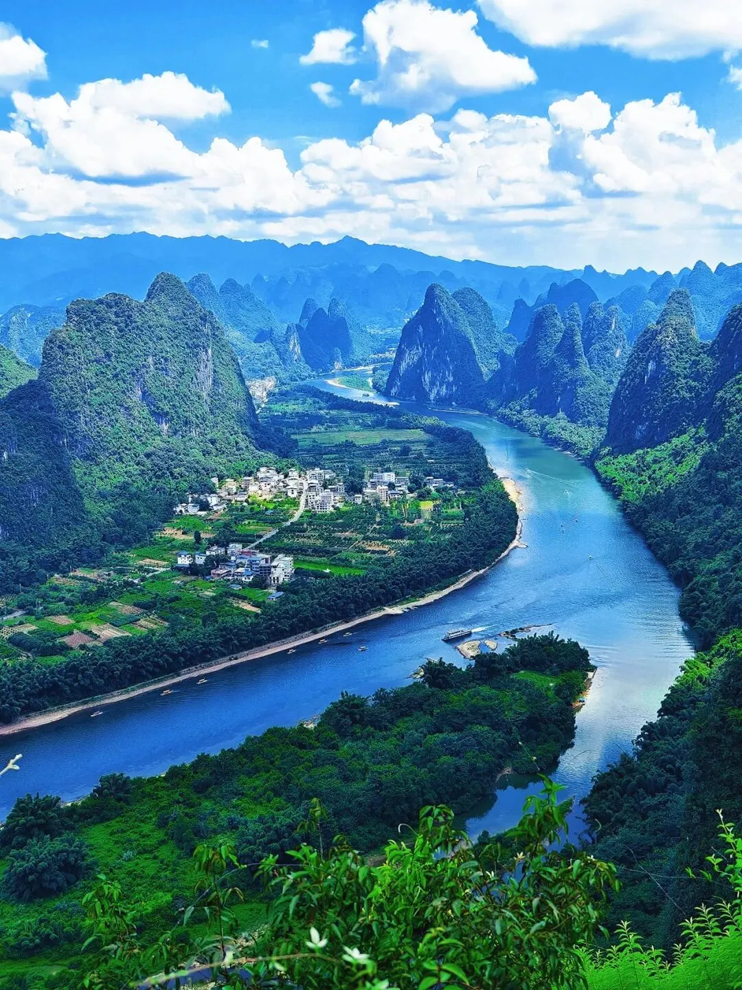 漓江山水甲天下,碧水如带,峰林如画,乘船穿行其间,宛如走进流动的山水长卷。两岸翠竹、田园、奇峰相映成趣,一步一景,是中国最具诗意的水墨仙境。