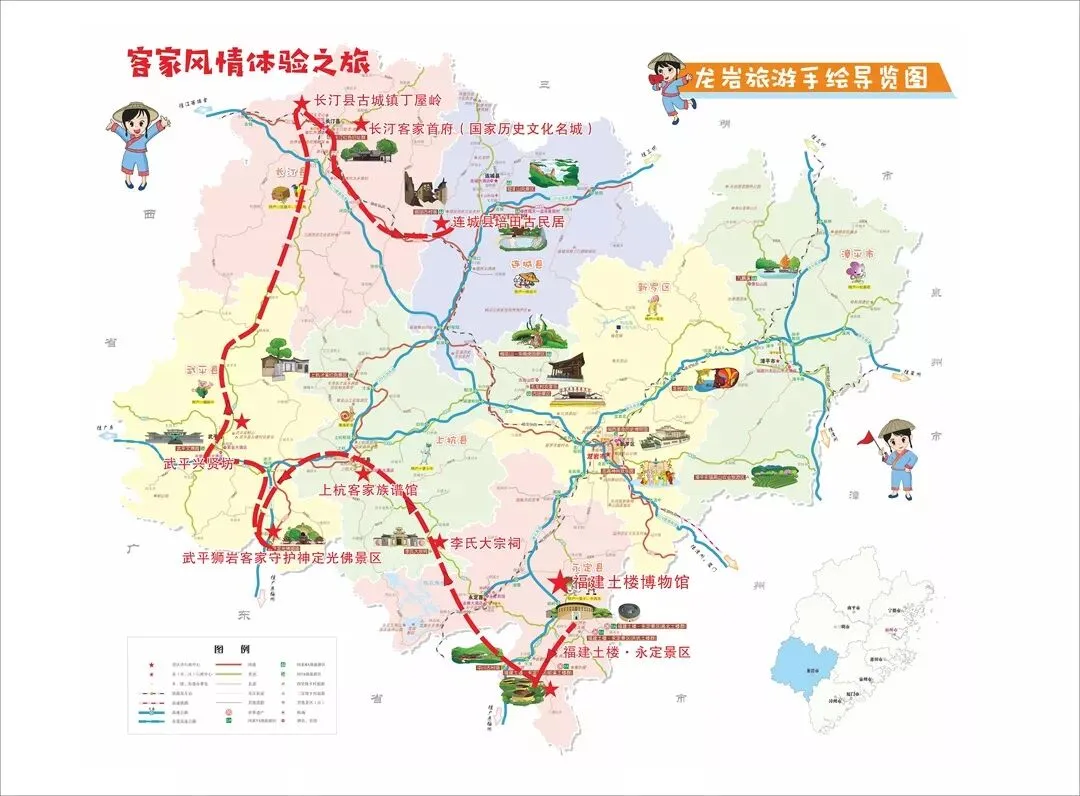 福建土楼·永定景区→上杭客家族谱博物馆→武平狮岩客家守护神定光佛景区→长汀客家首府(国家历史文化名城)→连城县培田古民居