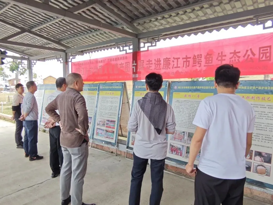 首站展览落地廉江市鳄鱼生态公园,将人文底蕴与生态风光巧妙融合,为前来休闲游玩的市民游客带来了一场别样的文化之旅。游客们驻足观赏、细细品读,从灵动威武的舞鹰雄表演瞬间,到匠心独运的古琴斫制、手工造纸工序,再到鲜香诱人的非遗美食制作技艺,每一幅图片都诉说着廉江的百年传承与民间智慧。