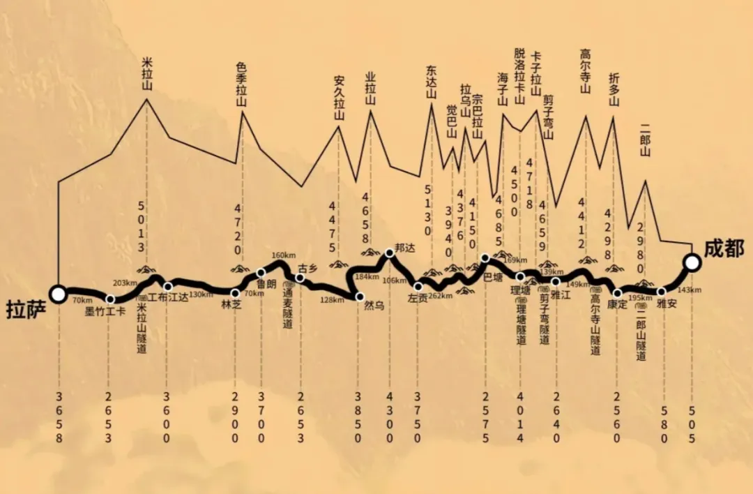 318川藏线东起成都,西至拉萨,全长约2140公里,串联起康定、新多桥、理塘、毛垭大草原、怒江72拐、然乌湖、米堆冰川、南迦巴瓦峰、布达拉宫等无数地标,全程要跨越13座高山,最高点海拔5013米,全程跌宕起伏,完全不亚于坐过山车。
