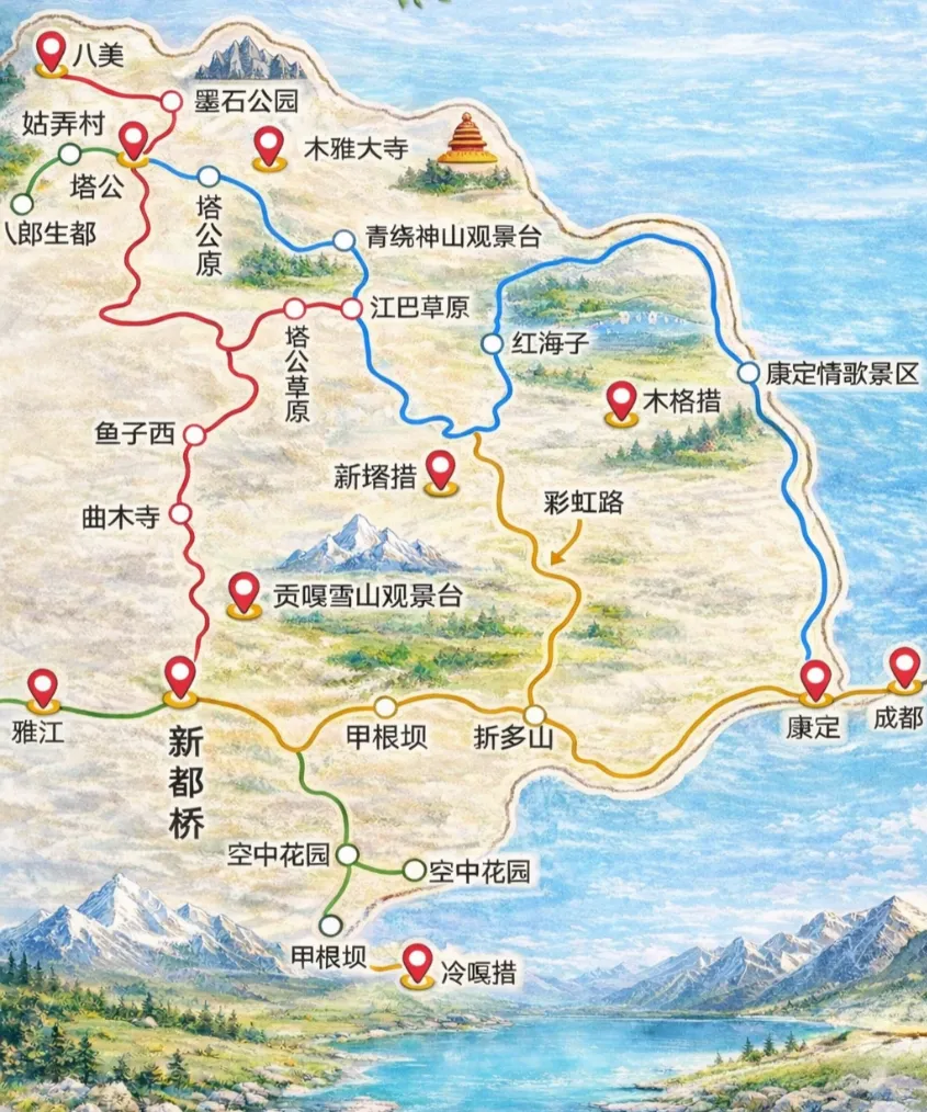景点:泸定桥、折多山垭口(4298m)、新都桥光影