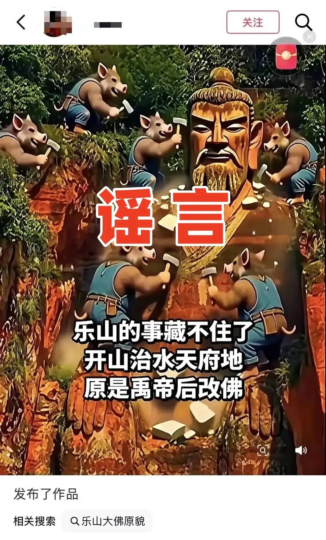 记者注意到,“乐山大佛是大禹雕像改建”的说法可追溯至数年前,近期再度被部分网民以视频、帖文形式,进行传播。不少内容还是AI生成,以及通过P图将乐山大佛头像换成大禹头像,并配文:甭管真假,看着顺眼多了。