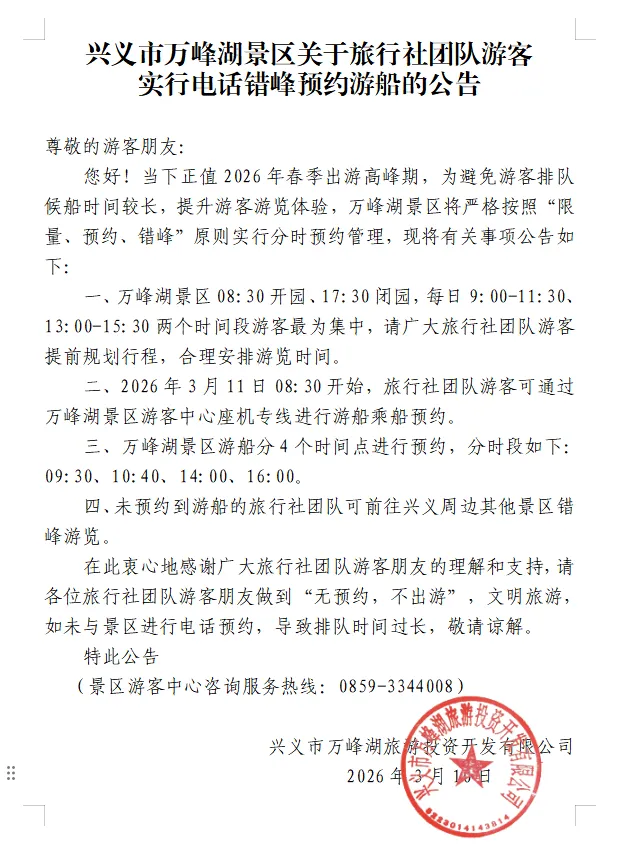兴义市万峰湖景区关于旅行社团队游客实行电话错峰预约游船的公告 尊敬的游客朋友: 您好!当下正值2026年春季出游高峰期,为避免游客排队候船时间较长,提升游客游览体验,万峰湖景区将严格按照“限量、预约、错峰”原则实行分时预约管理,现将有关事项公告如下: 一、万峰湖景区08:30开园、17:30闭园,每日9:00-11:30、13:00-15:30两个时间段游客最为集中,请广大旅行社团队游客提前规划行程,合理安排游览时间。 二、2026年3月11日08:30开始,旅行社团队游客可通过万峰湖景区游客中心座机专线进行游船乘船预约。 三、万峰湖景区游船分4个时间点进行预约,分时段如下:09:30、10:40、14:00、16:00。 四、未预约到游船的旅行社团队可前往兴义周边其他景区错峰游览。 在此衷心地感谢广大旅行社团队游客朋友的理解和支持,请各位旅行社团队游客朋友做到“无预约,不出游”,文明旅游,如未与景区进行电话预约,导致排队时间过长,敬请谅解。 特此公告 (景区游客中心咨询服务热线:0859-3344008)