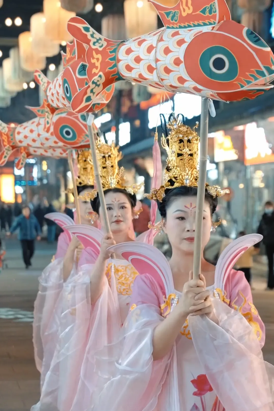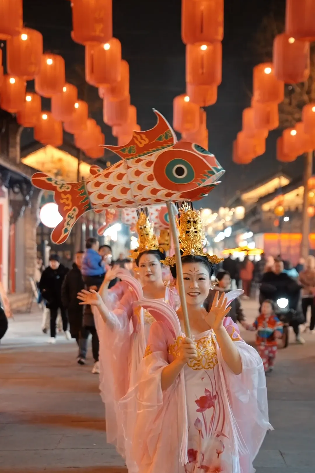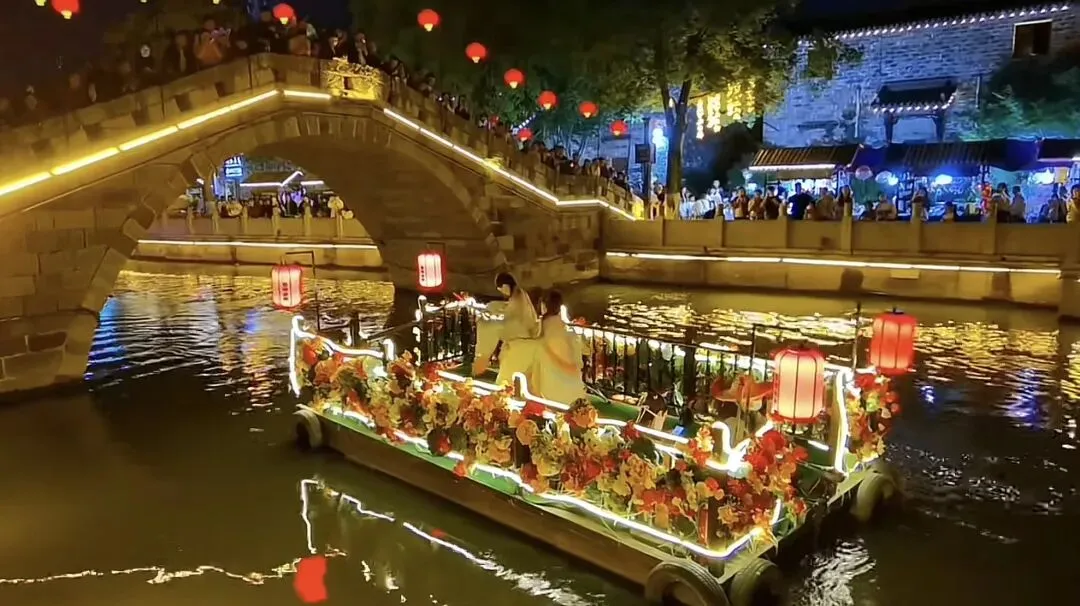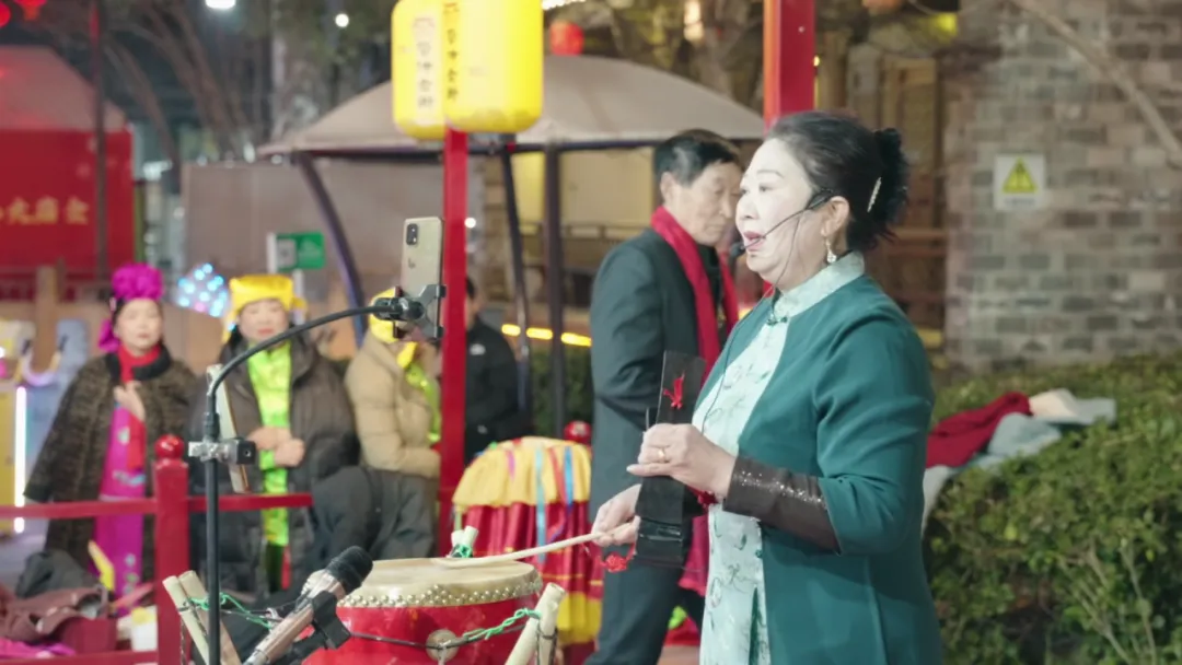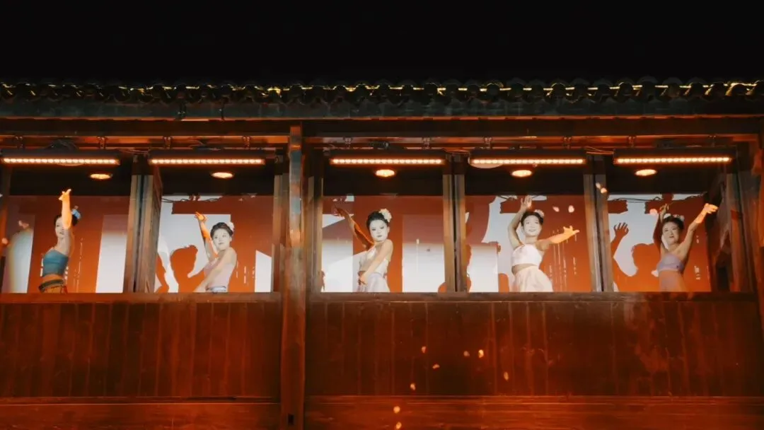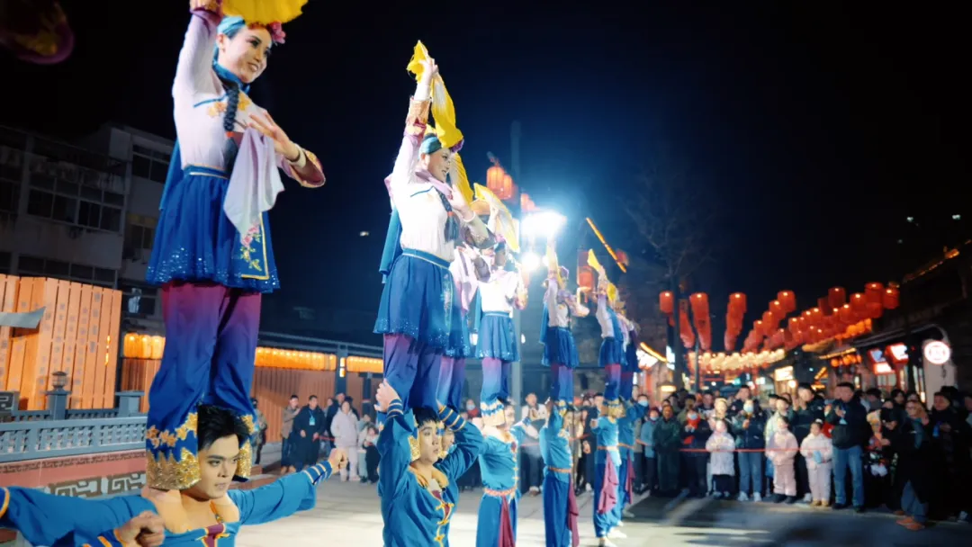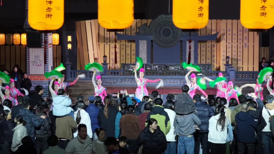 驻足春秋里,春日的热闹与美好在此尽情绽放。颍上好礼三楼,《金粉落・忆商谣》热情开演,金色粉末漫天洒落,洒金送福,将新年的好运与春日的欢喜一并送上;夜色初临,桥头鱼灯摇曳,点点光影如游鱼嬉戏于春风中,唯美浪漫;国家级非遗花鼓灯舞蹈铿锵登场,扇帕翻飞,舞步欢快,尽显非遗文化的鲜活生命力。