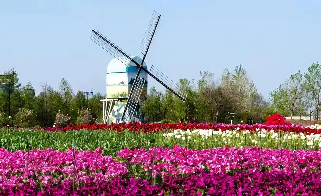 这里是"中国郁金香第一花海",3000万株郁金香在春天织成无边花田,带来极致的视觉震撼与浪漫体验,花海与荷兰风情建筑的完美结合。