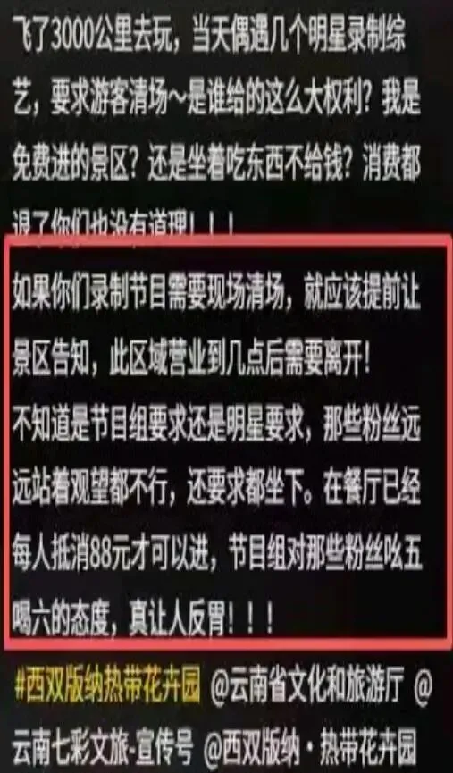 事情的起因是景区内承接了商业拍摄活动,三月七日当天,西双版纳热带花卉园的棕榈沙滩帕姆班区域,要进行一档音乐节目的录制工作。景区和节目组原本商定,将拍摄时间安排在景区正常开放时间之外,景区的开放时间为早上八点到傍晚六点,这样的安排本不会打扰到普通游客的游览。可实际执行时,为了让拍摄工作按时推进,景区和节目组没有遵守原定计划,而是在闭园前二十分钟,就开始对仍在园区内的游客进行引导,要求大家尽快结束游览离开景区。