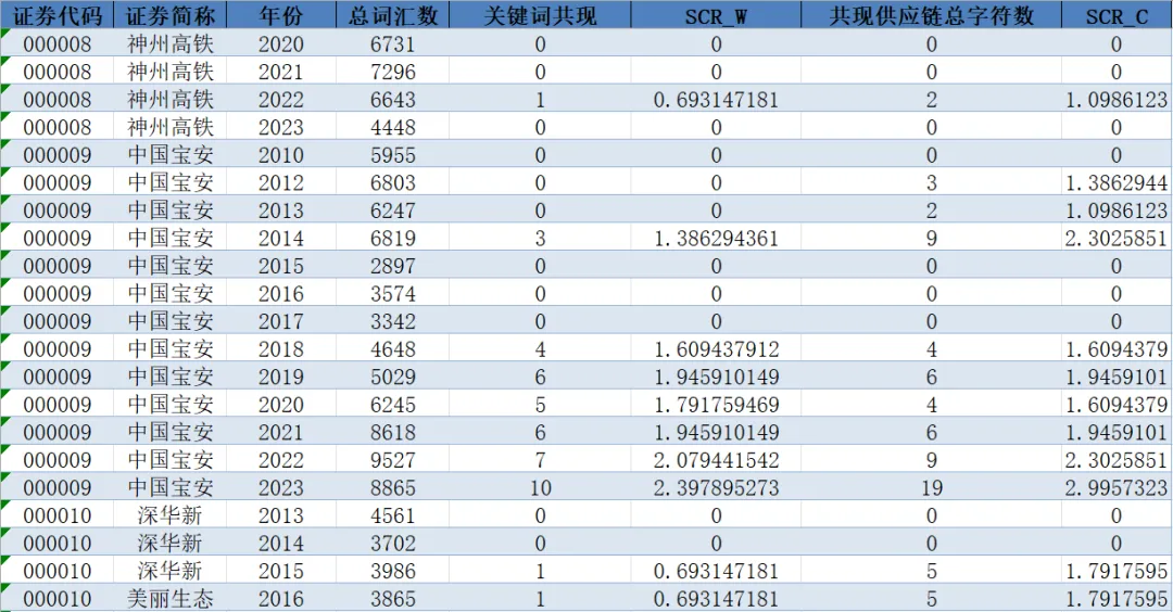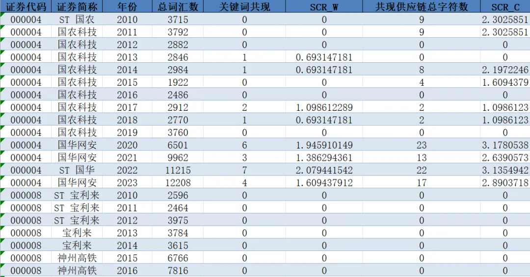 关键词共现 | SCR_W | 共现供应链总字符数 | SCR_C |