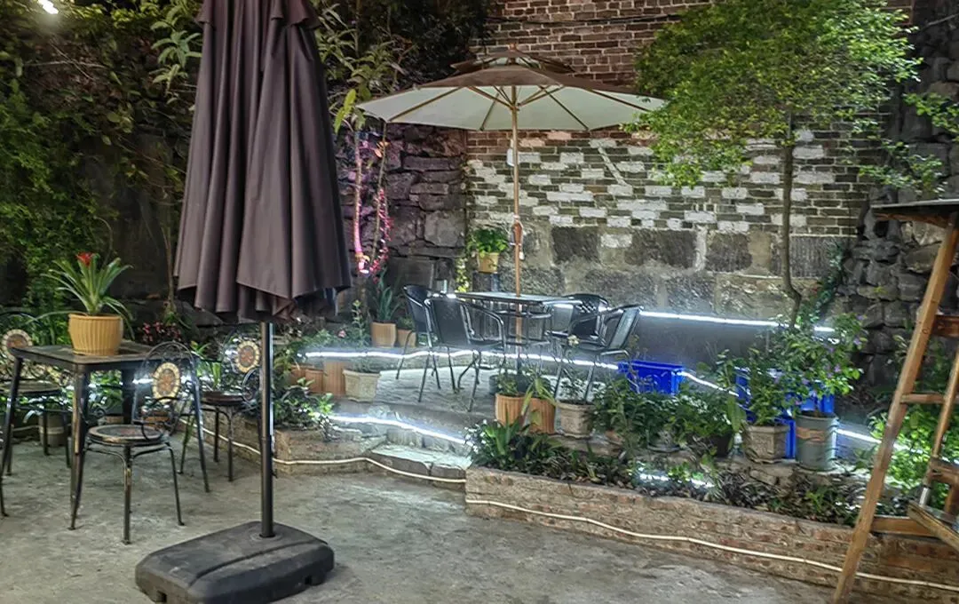 客栈3层,带阁楼,整体建筑面积约360平米,并有一个80平米的小院;其中,一楼为茶饮和公共休闲的大厅,二楼三楼为住宿客房;室外有一个大花园,顶楼有一个观景露台,可供三五好友喝酒聊天赏花看月。