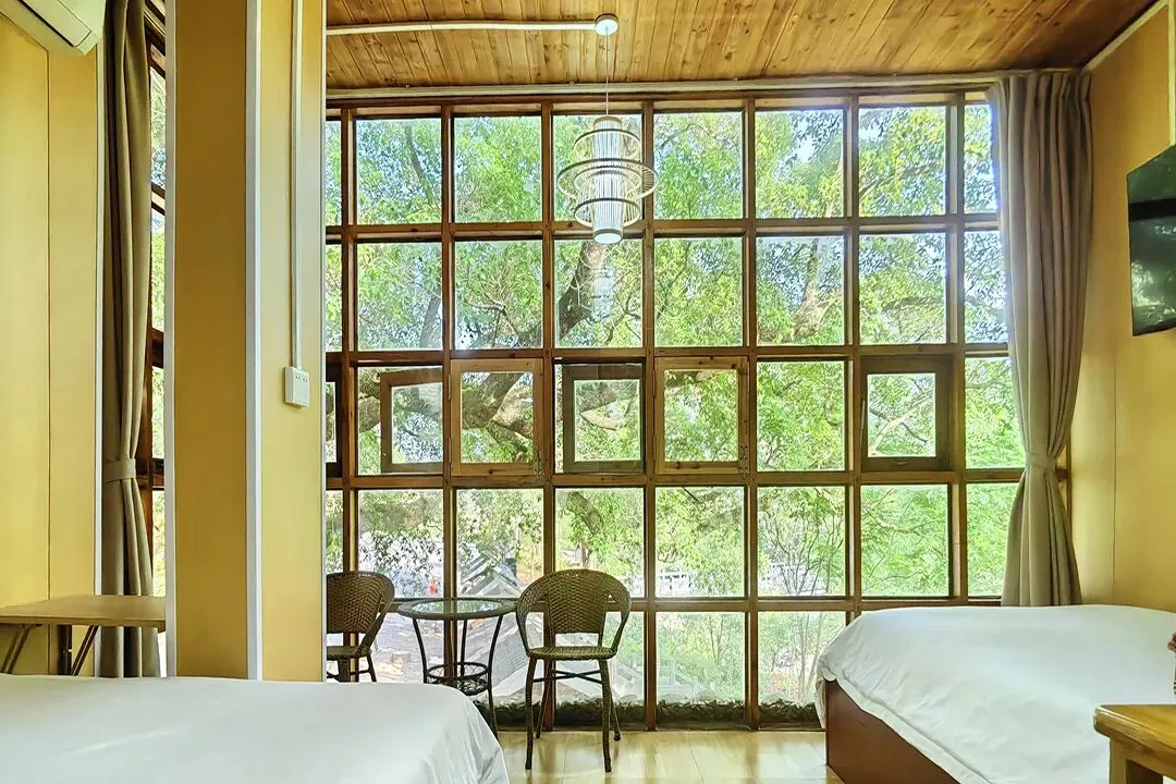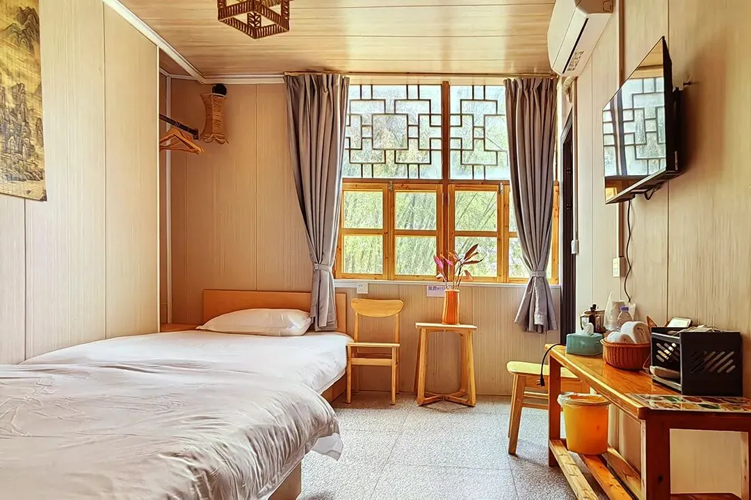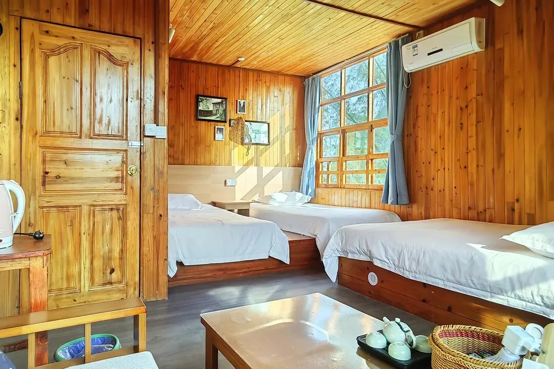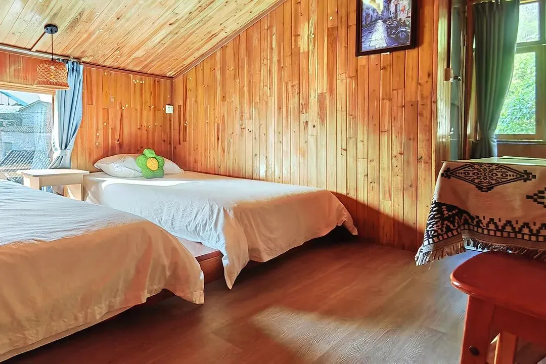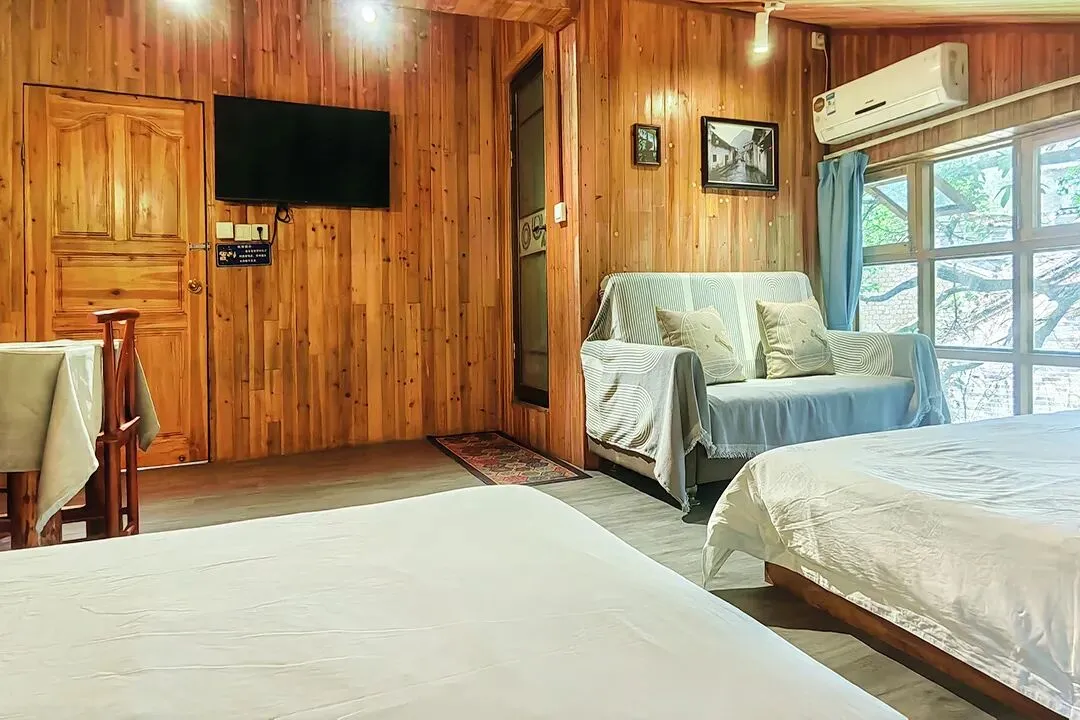 客栈共有客房11间,拥有大床房、双床房、三人间、亲子四人间和家庭套间等房型;每间客房均有独立卫生间和落地窗,室内通透明亮,有较好的自然采光和通风;整体风格保持了古镇的古朴和静怡,居住起来非常惬意。