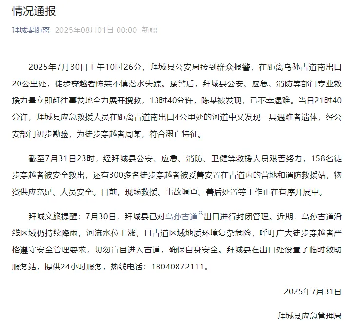 2025年7月30日上午10时26分,拜城县公安局接到群众报警,在距离乌孙古道南出口20公里处,徒步穿越者陈某不慎落水失踪。接警后,拜城县公安、应急、消防等部门专业救援力量立即赶往事发地全力展开搜救,13时40分许,陈某被发现,已不幸遇难。当日21时40分许,拜城县应急救援人员在距离古道南出口4公里处的河道中又发现一具遇难者遗体,经公安部门初步勘验,为徒步穿越者周某,符合溺亡特征。